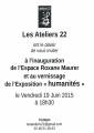 Le vendredi 19 juin 2015 à 18h30 les Ateliers 22 ont le plaisir de vous inviter à l’inauguration de "L’Espace Roxane Maurer" et au Vernissage de l’Exposition "Humanités" Regard croisés sur les peintures de Roxane Maurer et les sculptures de Yo Pinier.