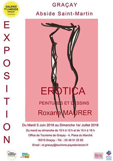 Exposition Erotica - Peintures et dessins de Roxane Maurer, juin 2018, Gracay. Commissaire de l’exposition Rémy Duroir. — Galerie de l’abside Saint-Martin, office de Tourisme de Graçay 18 juin 2018. C’est en présence de son mari, Valère Staraselski, que Rémy Duroir a présenté l’exposition de Roxane Maurer.